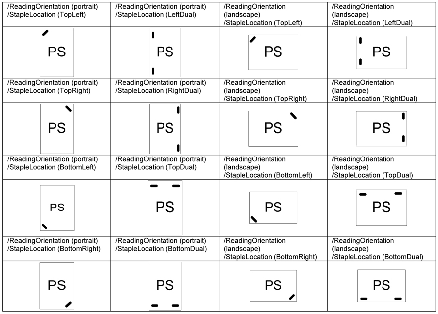 Note: There are several ways of expressing the same physical staple location. For example (portrait) and (TopLeft) is equivalent to (landscape) and (TopRight) in terms of physical stapling, feed edge and applied rotation.