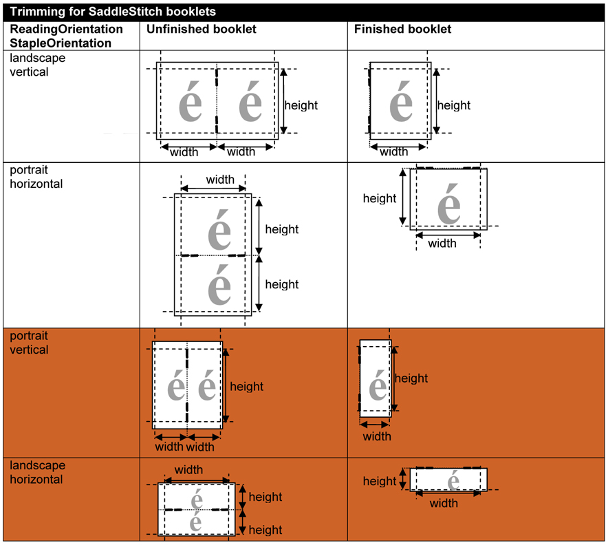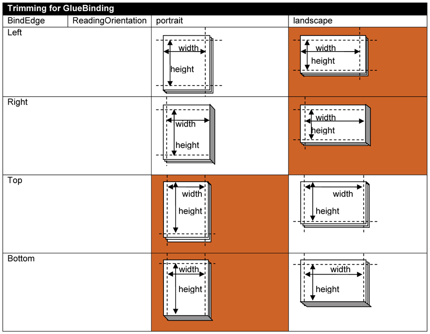 Trimming can be done after booklet making or glue binding. The size of the trim is defined by TrimSize in the TrimDetails dictionary. The TrimSize is the size of the finished book, after folding and trimming.