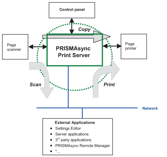 The PRISMAsync Print Server is part of the imagePRESS V1350. The print server handles job control and data processing for print, scan and copy.
