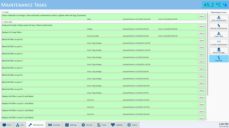 Dacă nu ați efectuat întreținerea zilnică a capului de imprimare, apare o casetă de dialog cu o interogare pentru efectuarea sau amânarea acestei sarcini. Dacă alegeți să efectuați întreținerea capetelor de imprimare, va apărea ecranul de întreținere periodică și se va afișa temperatura cernelei. Atunci când cerneala se află la temperatura potrivită de curățare, puteți efectua întreținerea capetelor de tipărire.