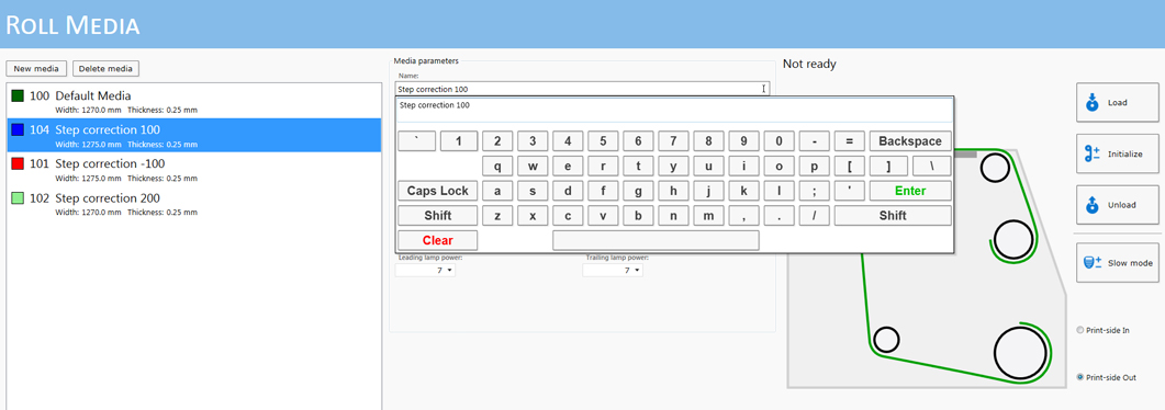 Kaikki valintaikkunassa muutetut parametrit otetaan käyttöön seuraavassa rullamateriaalin tulostustyössä, vaikka muutosta ei olisi tallennettu. Tämä mahdollistaa väliaikaiset muutokset parametreihin ilman materiaalin tallentamisen tarvetta.