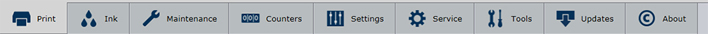 Zur Anzeige der Druckersoftware verfügt der Drucker über ein LCD-Display. Die Software umfasst sieben Hauptmodule, die jeweils über eine Registerkarte unten auf dem Display angezeigt werden können. Klicken Sie zum Aufrufen des gewünschten Moduls mit der Maus auf die jeweilige Registerkarte. Wenn die Software nach dem Einschalten bzw. Zurücksetzen des Druckers vollständig geladen wurde, wird standardmäßig das Auftragssteuerungsmodul angezeigt.