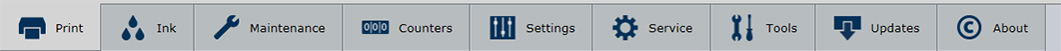 Το λογισμικό εκτυπωτή εμφανίζεται στο μόνιτορ LCD. Η διεπαφή έχει επτά κύρια τμήματα, τα οποία είναι προσβάσιμα από τις καρτέλες που βρίσκονται στο κάτω μέρος της οθόνης. Κάντε κλικ σε αυτές τις καρτέλες για να αποκτήσετε πρόσβαση στα τμήματα. Ο Έλεγχος εργασίας εκτύπωσης είναι το προεπιλεγμένο τμήμα που εμφανίζεται όταν το λογισμικό ολοκληρώσει τη φόρτωση μετά την ενεργοποίηση ή την επαναφορά του εκτυπωτή.
