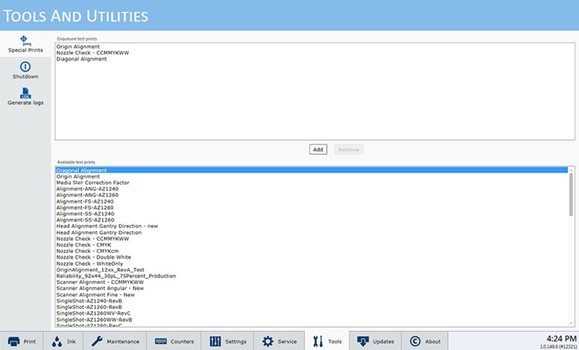 Modulul Tipăriri speciale afișează două liste. Lista de jos afișează tipăririle speciale disponibile. Unele dintre aceste tipăriri sunt utilizate de tehnicienii de service pentru a regla și depana imprimanta. Unele sunt de interes pentru operator: tipărirea efectuată în fabrică, tipăririle riglei de masă, tipărirea pentru verificarea duzelor și tipărirea factorului de corecție a pasului suportului.