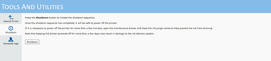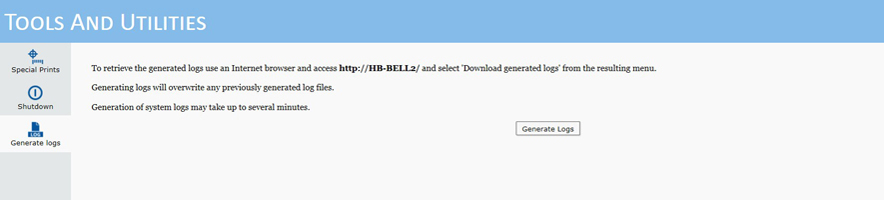 Modulul pentru instrumente și utilitare are trei sub-module: Tipăriri speciale, închidere și jurnale de sistem. Atunci când faceți clic pe fila Instrumente, tipăririle speciale apar întotdeauna primele. Faceți clic pe celelalte pictograme pentru a accesa sub-modulele.