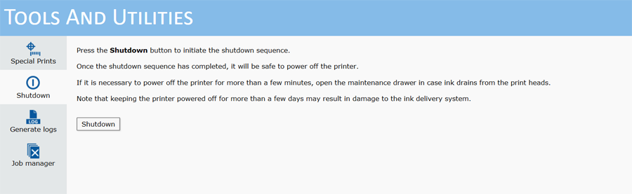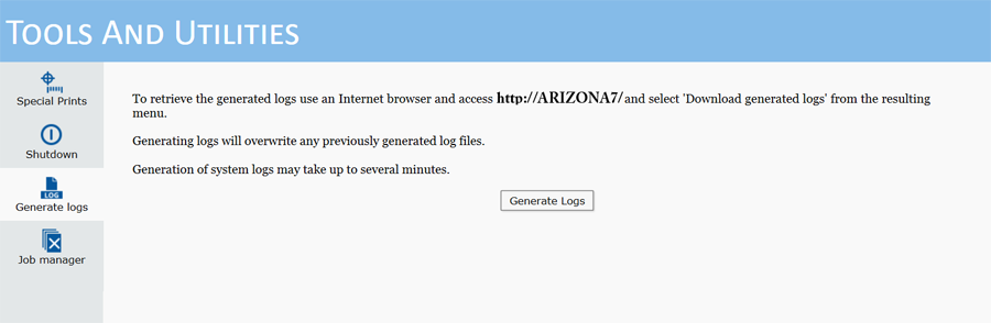 Työkalujen ja apuohjelmien moduulissa on kolme alamoduulia: Erikoistulosteet, sammutus ja järjestelmälokit. Kun napsautat Työkalut-välilehteä, Erikoistulosteet tulee aina esiin ensin. Pääset alamoduuleihin napsauttamalla muita kuvakkeita.