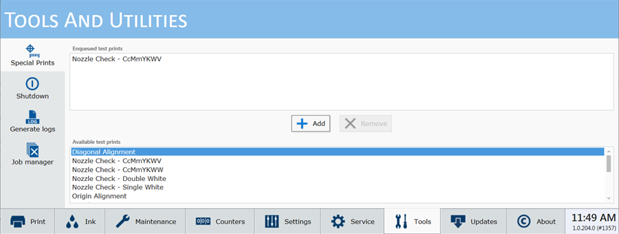 Jet-Stability-Test-Print -testitulostusta käytetään sen määrittämiseen, onko tulostuspään suihkun vakaus kunnossa raskaissa tulostusolosuhteissa. Testitulosteita on kaksi erillistä, yksi värikanaville ja yksi valkoiselle kanavalle (kanaville). Jos halutaan tulostaa suihkun stabiilisuustesti valkoiselle, voidaan ensin tulostaa väritesti mustan alustan luomiseksi.