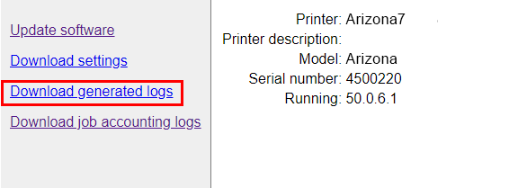 Käytä internetselainta päästäksesi käsiksi lokitiedostoihin. Kirjoita http://,tulostimen verkkonimi ja portin numero :8080. Verkon nimi löytyy tulostimen näytöstä välilehdeltä [Settings] / [Network connection]. Jos verkon nimi on ARIZONA7, kirjoita selaimen osoitekenttään http://arizona7:8080 .