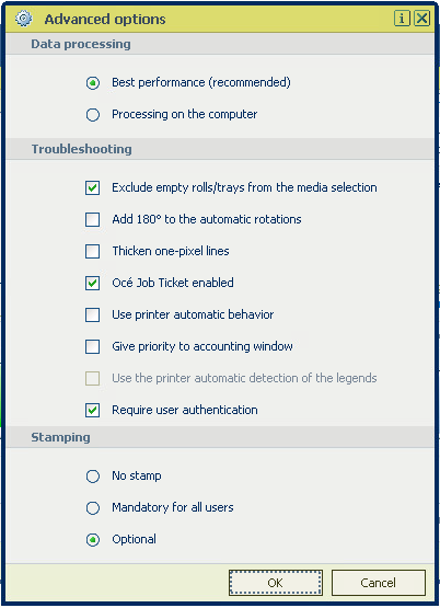 Dans le menu [Options], situé dans le coin supérieur droit de l'écran, choisissez [Options avancées]. Assurez-vous que la case [Océ Job Ticket activé] de la section [Dépannage] est cochée pour ignorer les valeurs par défaut des paramètres du travail.