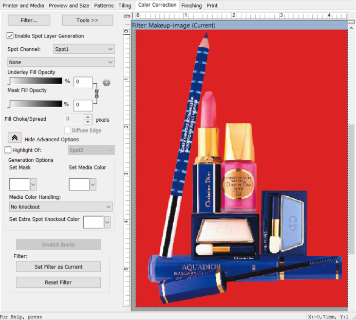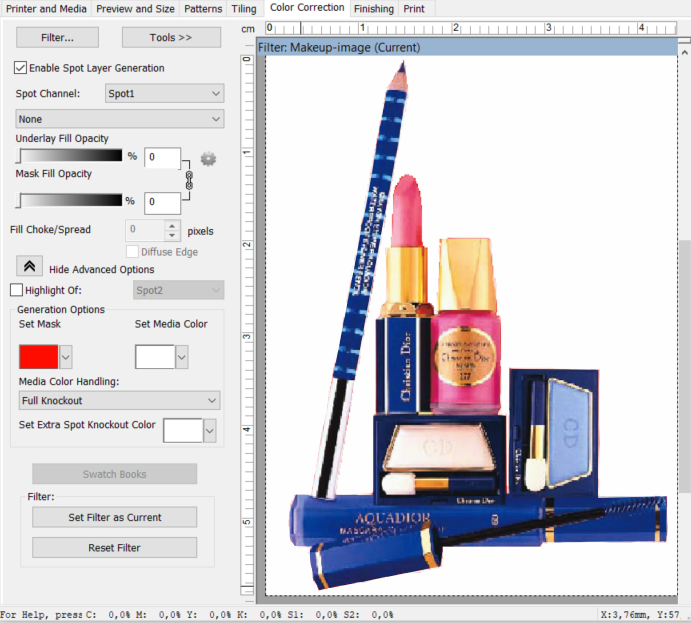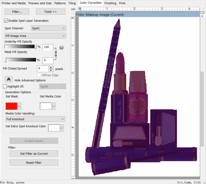 Spot Layer es una herramienta de ONYX Thrive que le ayuda a definir las áreas que deben imprimirse con tinta blanca o barniz/brillo sin necesidad de edición adicional en Adobe Photoshop o Adobe Illustrator.