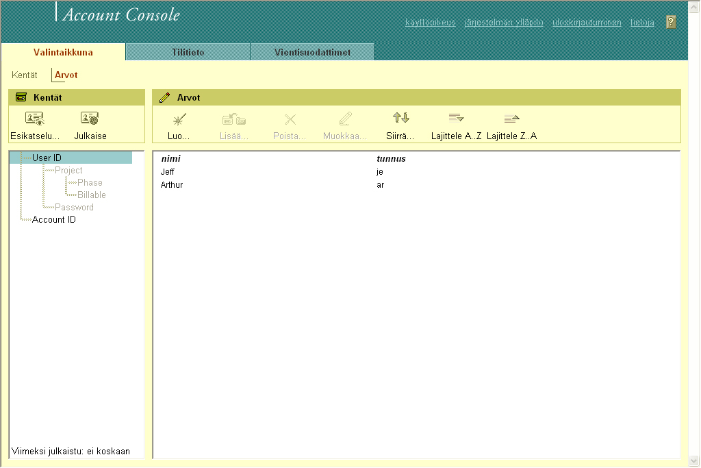 Tilitiedot-valintaikkunan hallinta, esikatselu ja julkaisu