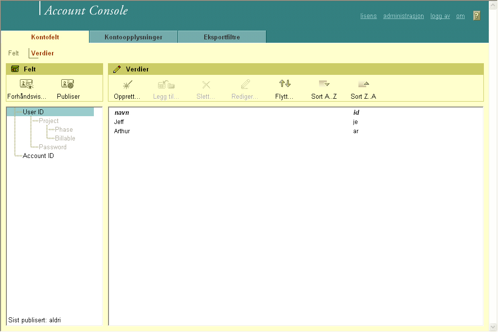 Administrere, forhåndsvise og publisere kontoinformasjonsdialogen