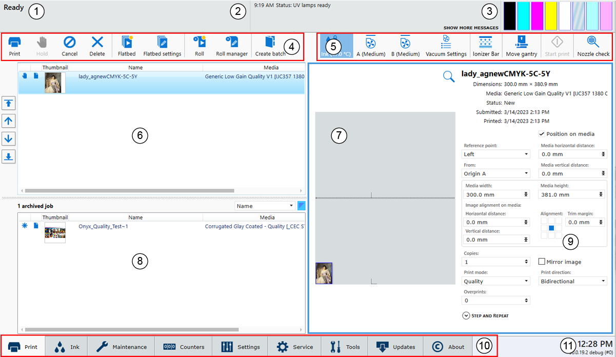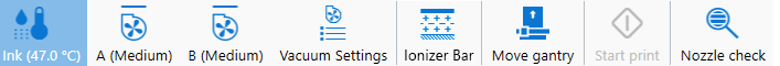 Εμφανίζει τα εικονίδια για τη θερμοκρασία μελανιού, το κενό στο τραπέζι, τη γραμμή ιονιστή (προαιρετικά), τη μετακίνηση της γερανογέφυρας, την εκκίνηση/παύση εργασιών εκτύπωσης και την εκτύπωση ελέγχου ακροφυσίων. |