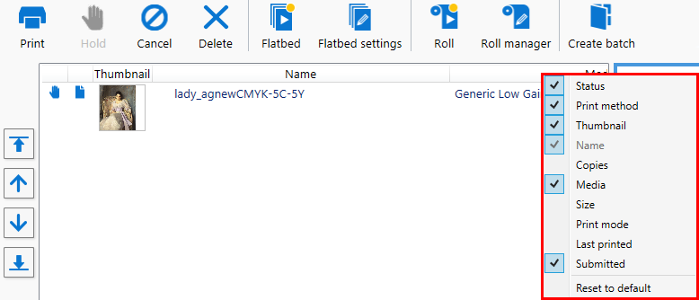 Αυτή η διαχείριση στηλών μπορεί επίσης να εφαρμοστεί στη λίστα ανενεργών εργασιών εκτύπωσης (βλ. 8) παρακάτω, καθώς και στη λίστα εργασιών στη λειτουργία δέσμης (βλ. Κεφάλαιο 5, «Εκτύπωση στη λειτουργία δέσμης»).