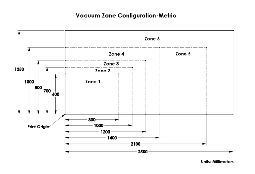 Ob dobavi so vakuumske cone konfigurirane za podporo medijev metričnih velikosti. Konfiguracijo z metričnih na imperialne lahko na terenu spremeni usposobljeni servisni tehnik (če je potrebno lahko to naredi tudi tehnik, ki namešča vaš tiskalnik). Namen vakuumskih con je skrajšanje časa pred tiskanjem najpogostejših velikosti medija z zmanjšanjem potrebe po maskiranju odprtih področij na vakuumski mizi.