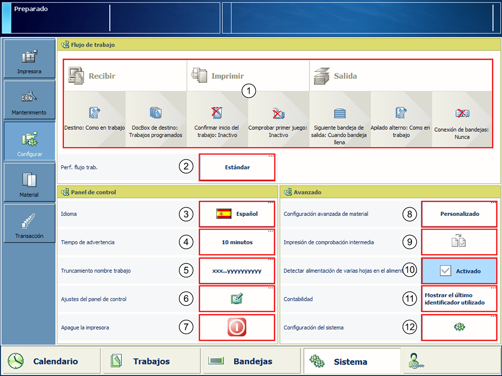 La vista [Sistema] da acceso a la información del sistema y a los ajustes del sistema e información del material.