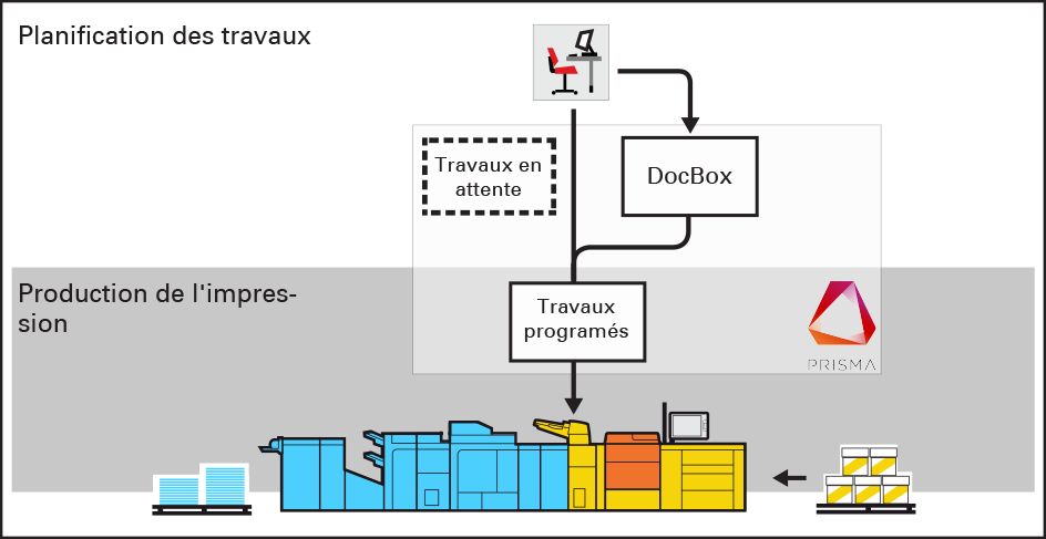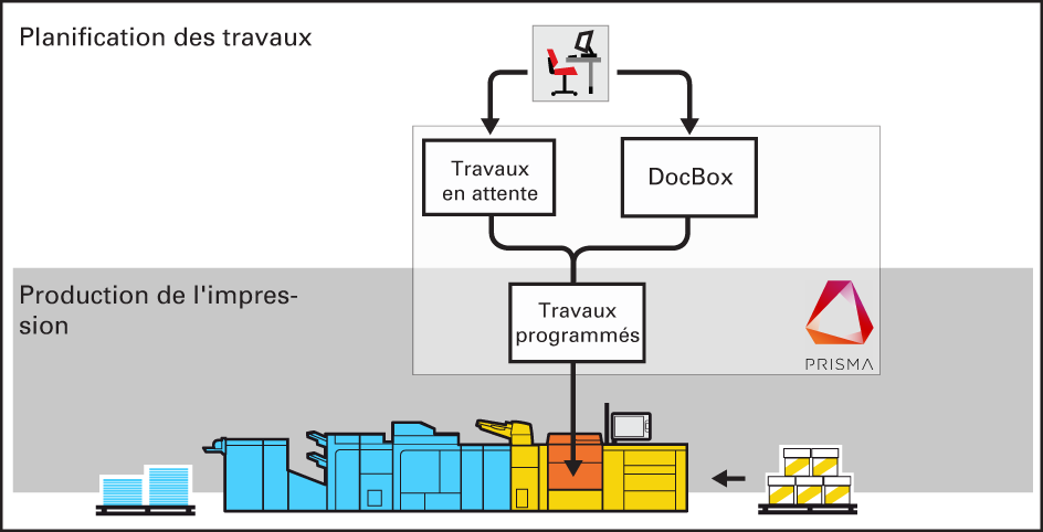 La machine imprime les travaux comme indiqué dans le ticket de travail. |
