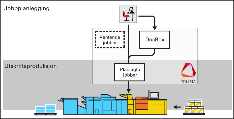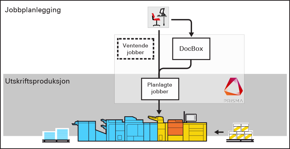 Maskinen brukes i forskjellige utskriftsmiljøer. Hvert miljø krever andre innstillinger for å optimalisere arbeidsflyten eller for å oppfylle dine personlige krav til arbeidsflyt. Maskinen inneholder en del standard arbeidsflytprofiler for å hjelpe deg med å optimalisere arbeidsflyten. Standardprofilene for arbeidsflyt er kombinasjoner av hyppig brukte innstillinger for utskriftsjobber ([Motta], [Skrive ut] og [Kopilevering] ). Arbeidsflytinnstillingene kan imidlertid ikke dekke alle mulige arbeidsflyter du kan trenge. Derfor kan du også definere innstillingene individuelt (tilpasset arbeidsflyt).