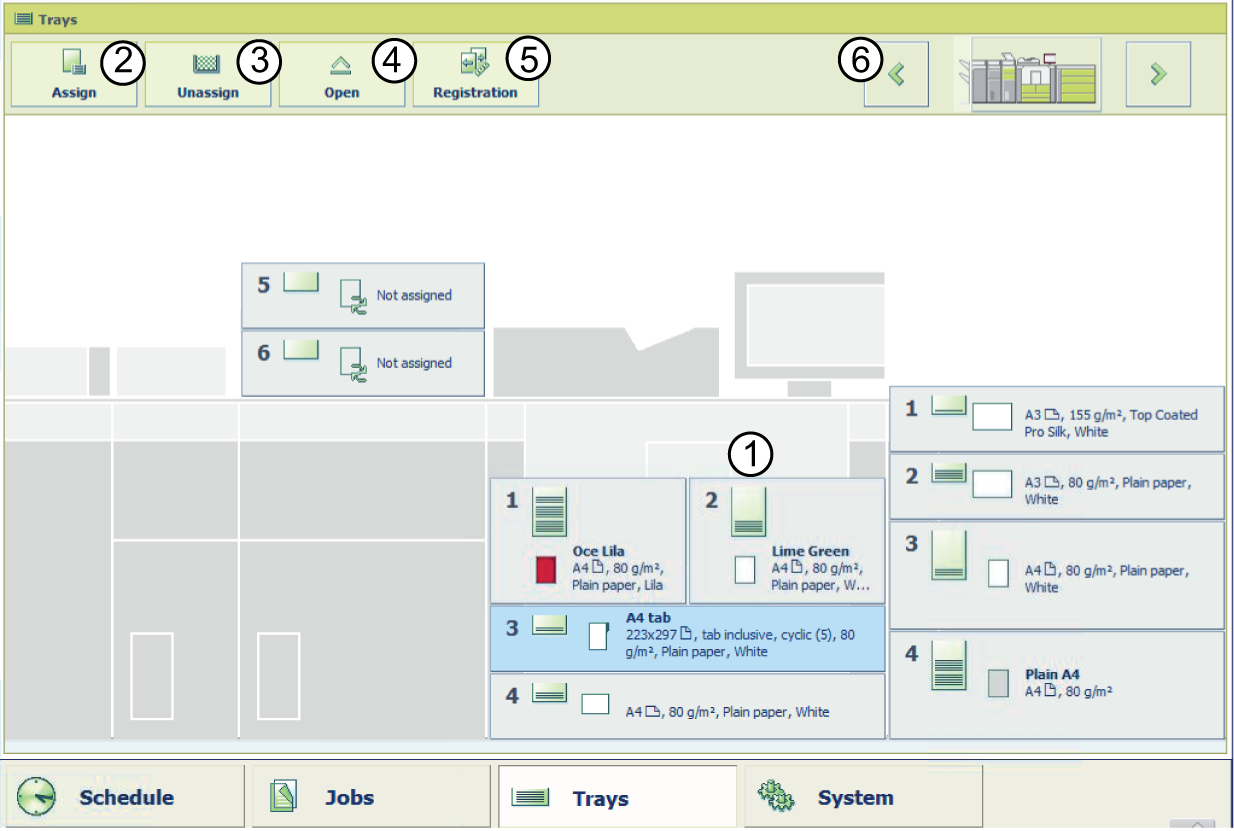 구성에 [트레이] 보기에서 한 개의 화면에 표시할 수 있는 것보다 많은 용지 모듈이 포함되어 있는 경우 화살표 버튼을 눌러 표시된 기계의 일부를 변경할 수 있습니다. |