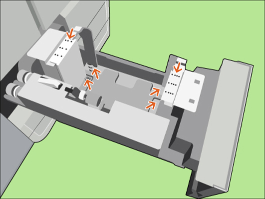 Dopasuj ręcznie położenie prowadnic papieru w dużej tacy do nowego rozmiaru nośnika.