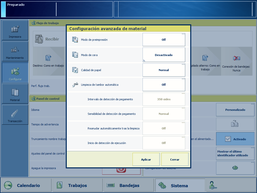 El sistema es capaz de manipular material preimpreso sin problema si se tienen en cuenta las directrices sobre tintas y materiales preimpresos. En caso de que se usen materiales o tintas no recogidos en las directrices, el uso de material preimpreso puede provocar problemas de calidad de impresión no deseados. Para evitar estos problemas de calidad de impresión, la impresora dispone de una función [Modo de preimpresión]. Se recomienda activar [Modo de preimpresión] cuando se producen problemas con el procesamiento de materiales preimpresos. El sistema se limpiará entonces a intervalos fijos. Se recomienda activar [Modo de preimpresión] solo cuando se procese material preimpreso. Después se debe desactivar la función.