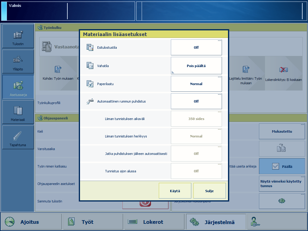 Järjestelmä voi käsitellä esipainettua materiaalia ongelmitta, jos esipainettua materiaalia ja musteita koskevia ohjeita noudatetaan. Jos materiaalia tai musteita ei ole lueteltu ohjeissa, esipainetun materiaalin käyttäminen voi johtaa epätoivottuihin tulostusongelmiin. Tulostuslaatuongelmien välttämiseksi tulostimessa on käytettävissä [Esitulostustila] -toiminto. On suositeltavaa ottaa [Esitulostustila] käyttöön, jos esipainetun materiaalin käsittelemisessä ilmenee ongelmia. Järjestelmä puhdistetaan sitten määrätyin väliajoin. On suositeltavaa ottaa [Esitulostustila] käyttöön vain, jos käsitellään esipainettua materiaalia. Tämän jälkeen toiminto tulisi ottaa pois käytöstä.