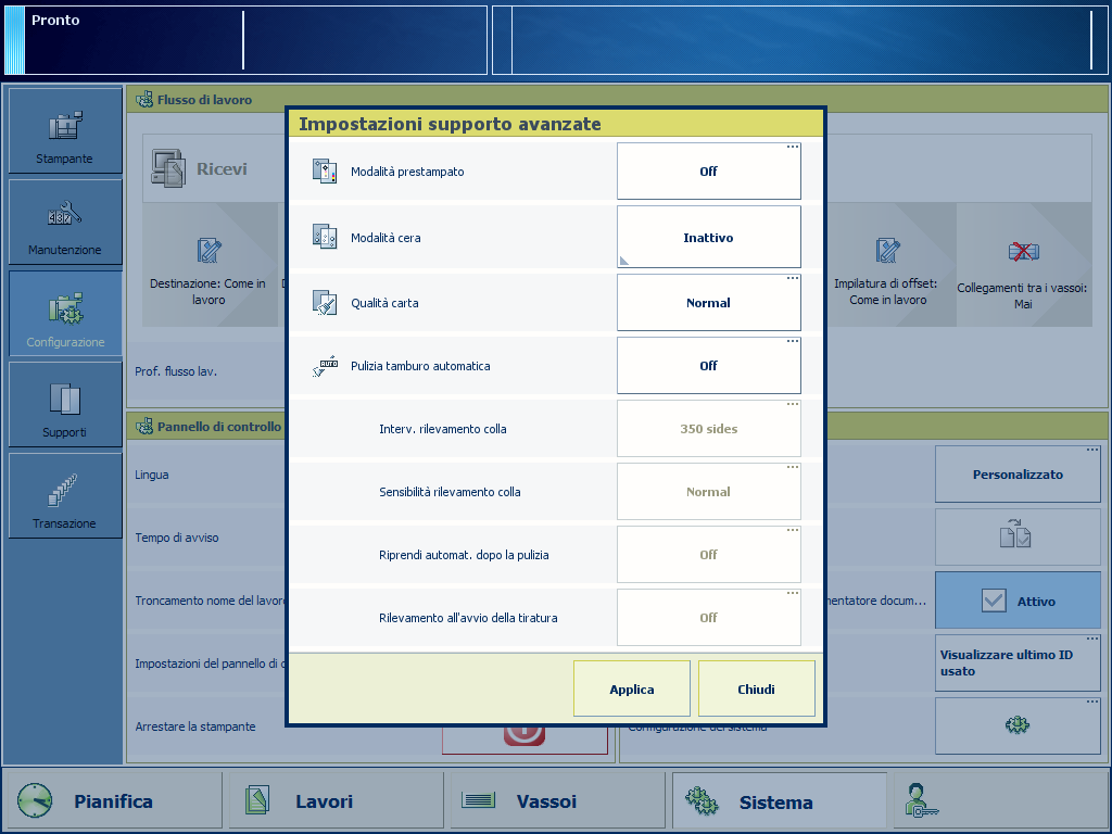 Il sistema è in grado di gestire senza problemi supporti prestampati se vengono prese in considerazione le linee guida degli inchiostri e dei supporti prestampati. Nel caso in cui vengano utilizzati supporti e inchiostri non elencati nelle linee guida, l'utilizzo di supporti prestampati potrebbe provocare problemi di qualità di stampa indesiderati. Per prevenire problemi di qualità di stampa, nella stampante è disponibile una funzione [Modalità prestampato]. Si consiglia di attivare la [Modalità prestampato] quando si verificano problemi di elaborazione dei supporti prestampati. In questo modo, il sistema viene pulito a intervalli regolari. Si consiglia di attivare la [Modalità prestampato] solo quando si elaborano supporti prestampati. Altrimenti, la funzione deve essere disattivata.