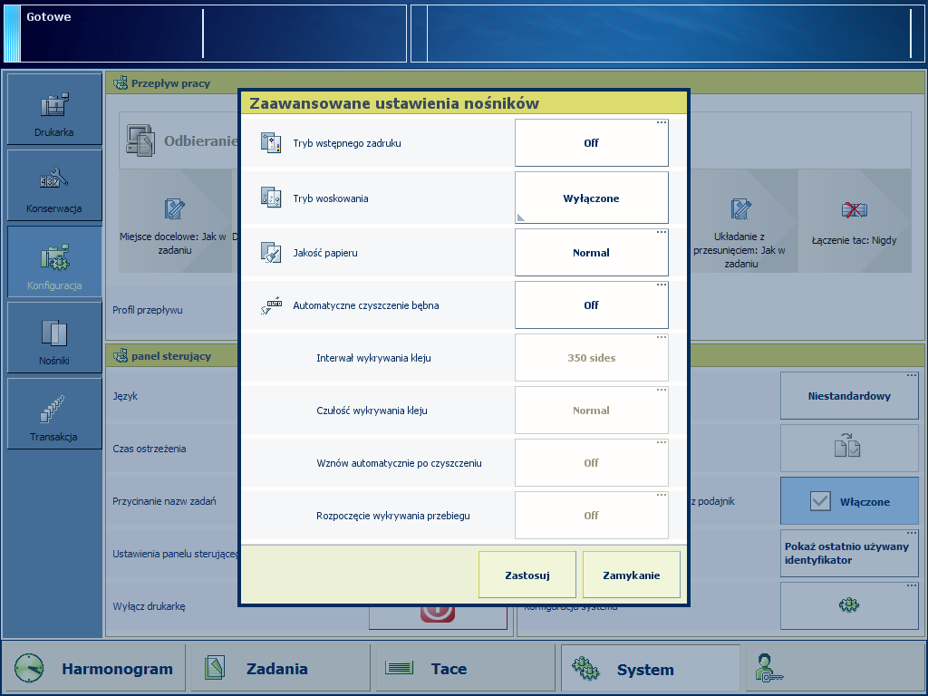 System obsługuje nośniki z nadrukiem bez problemów po zastosowaniu się do zaleceń dotyczących tuszów i nośników z nadrukiem. W przypadku, gdy dany nośnik lub tusz nie jest wymieniony w zaleceniach, zastosowanie nośnika z nadrukiem może spowodować niepożądane problemy z jakością wydruku. Aby zapobiec problemom z jakością druku, w drukarce dostępny jest [Tryb wstępnego zadruku]. [Tryb wstępnego zadruku] należy włączyć w przypadku problemów z obróbką nośnika z nadrukiem. System będzie wtedy czyszczony w określonych odstępach czasu. Zaleca się, aby [Tryb wstępnego zadruku] włączać jedynie podczas przetwarzania nośników z nadrukiem. Następnie należy wyłączyć tę funkcję.