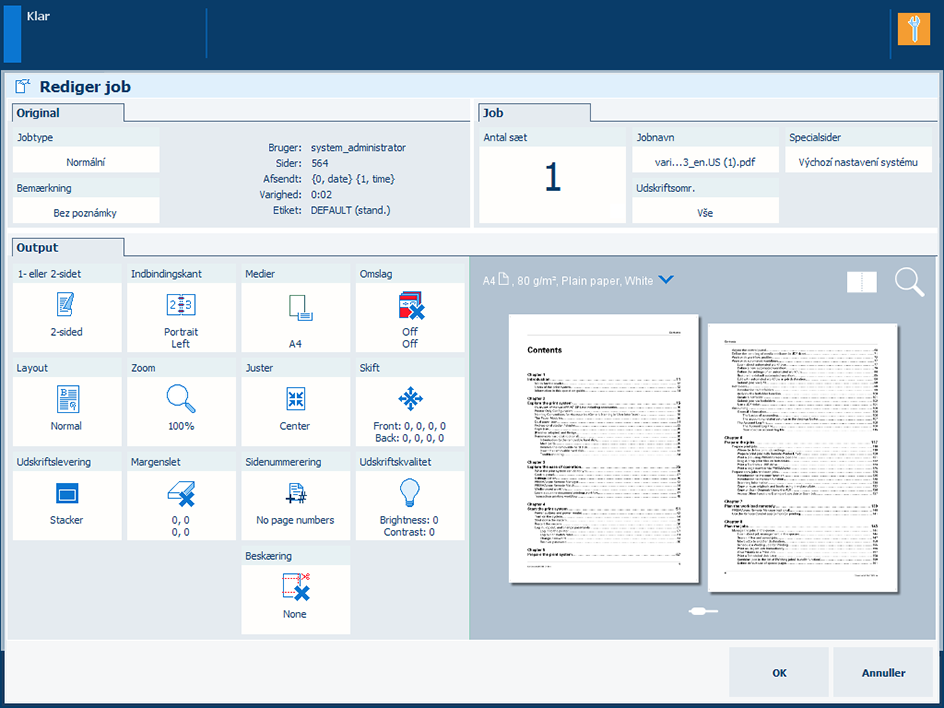 Normalt defineres indstillingerne for et udskriftsjob i PDL'er, programmer, printerdrivere, automatiserede arbejdsgange eller hotfolder-standardsedler. Men når et job er ankommet på PRISMAsync controlleren, kan du ændre en række jobindstillinger for alle de jobs, der ikke udskrives i øjeblikket. Dette afsnit indeholder en oversigt over de udskriftsjobindstillinger, du kan ændre via betjeningspanelet.