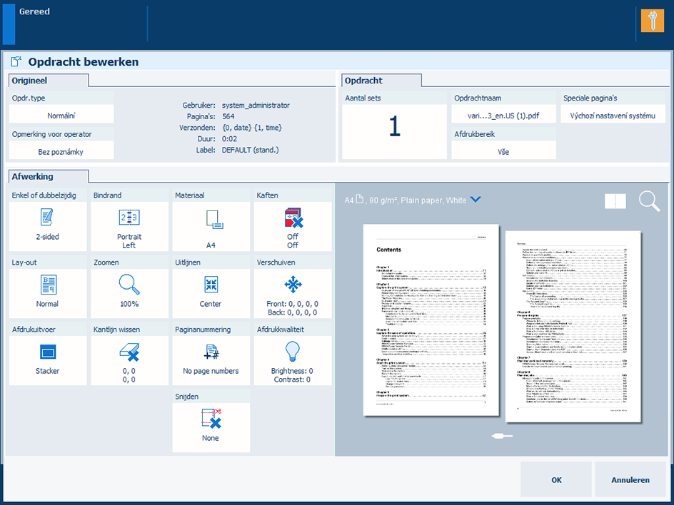 Geef op of de opdracht een voorblad moet bevatten. Het voorblad bevat: de naam van de afzender, de naam van de ontvanger, de accounting-id, de opdrachtnaam, de printernaam, de instructie van de operator, het kostencentrum en het aantal sets. |
