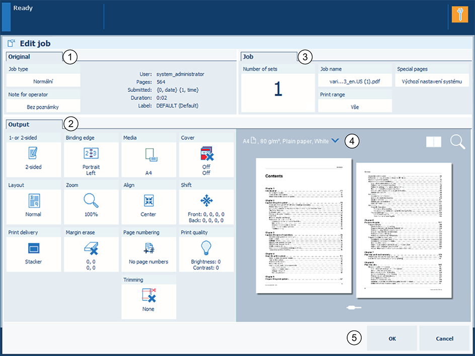 Wanneer de instelling [1e set contr.] is ingeschakeld, stopt de printer nadat de eerste set van een opdracht is afgedrukt. U kunt de kwaliteit van de uitvoer controleren. Deze instelling is alleen beschikbaar wanneer in het workflowprofiel [Eerste set controleren] is ingesteld op [Zoals in opdracht]. |
