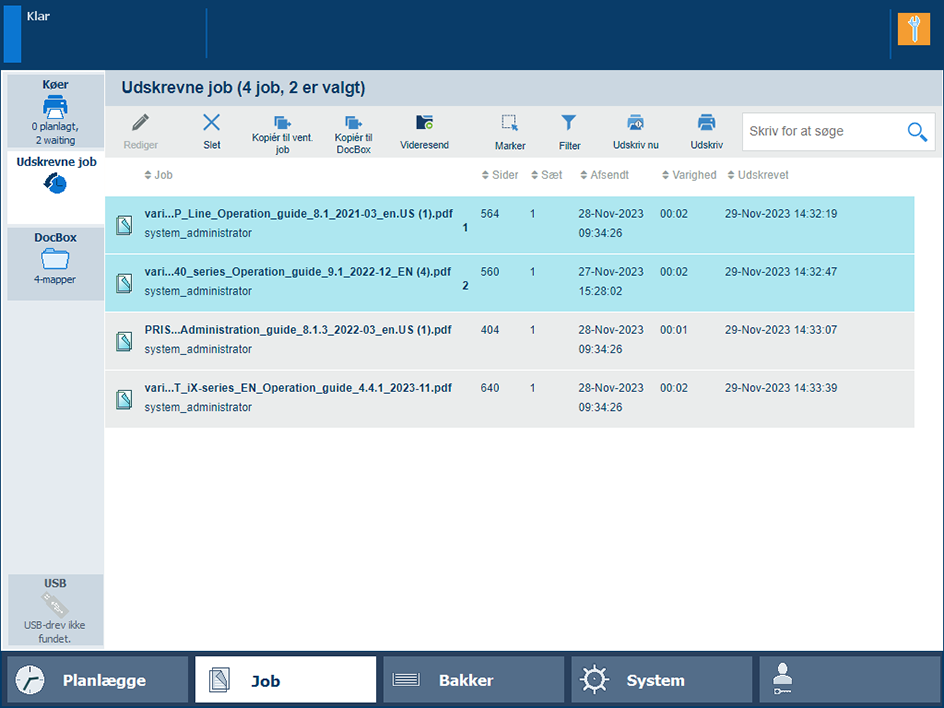 Når et job er udskrevet, er det synligt på listen over udskrevne job. Hvis du vil udskrive et udskrevet job igen, skal du vælge et udskrevet job fra listen over udskrevne job og trykke på indstillingen [Udskriv]. Med denne indstilling kan udskrevne job nemt omdirigeres til listen over planlagte job. Udskrevne job forbliver tilgængelige, efter udskrivningssystemet er lukket. Korrekturkopier eller stoppede job er ikke synlige på listen over udskrevne job.