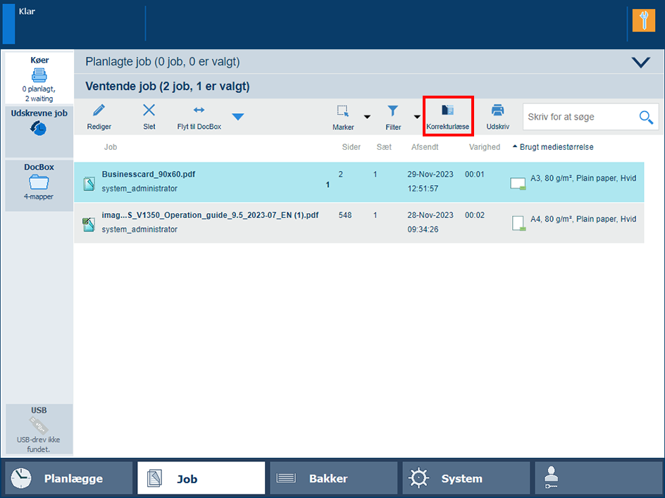 Når du vælger kommandoen [Korrektur], sendes en kopi af jobbet til den sidste position på listen over planlagte job. Det oprindelige job forbliver på listen over ventende job eller i DocBox. Du skal først flytte et udskrevet job til listen over ventende job, før du kan lave en korrektur.