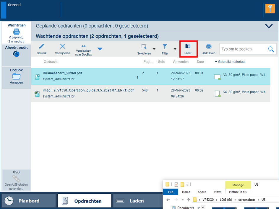Wanneer u de opdracht [Testafdruk] selecteert, wordt een kopie van de opdracht naar de laatste positie in de lijst met geplande opdrachten verplaatst. De oorspronkelijke opdracht blijft in de lijst met wachtende opdrachten of in de DocBox staan. U moet een opdracht naar de lijst met wachtende opdrachten verplaatsen voordat u een proefafdruk kunt maken.