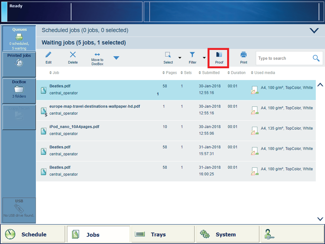 A [Ellenőrzés] parancs kiadásakor a munka egy példánya az ütemezett munkák listájának utolsó pozíciójába kerül. Az eredeti munka a várakozó munkák listájában vagy a DocBox mappában marad. Próbanyomat készítése előtt egy kinyomtatott munkát kell a várakozó munkák listájára helyeznie.