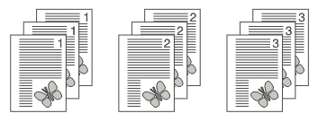 Změna způsobu řazení výtisků. Můžete vybrat řazení [Podle stránek] nebo [Podle sad].