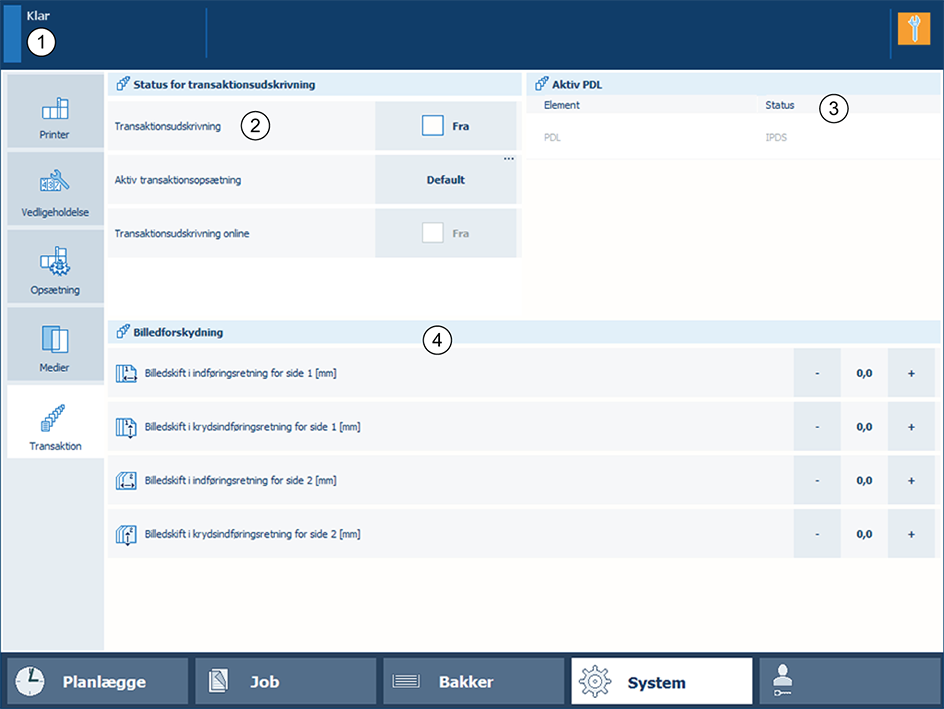 Transaktionsudskrivning kræver en licens. Visningen [System] på betjeningspanelet, viser kun [Transaktion] -sektionen, når der er en licens til transaktionsudskrivning.