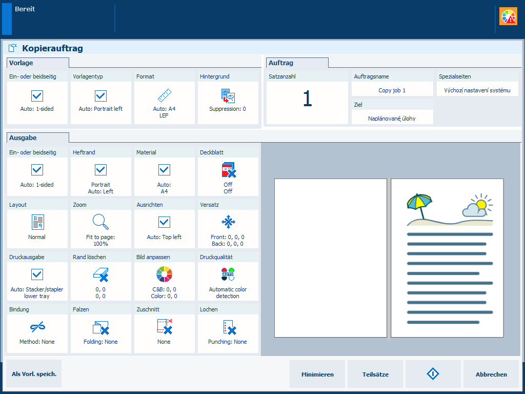 Die folgenden Tabellen zeigen die Kopierjobmerkmale, die Sie ändern können. Verwenden Sie die Einstellung [Minimieren], um die Definition des Kopierauftrags zu minimieren, wenn Sie andere Aufgaben auf dem Bedienfeld ausführen möchten.
