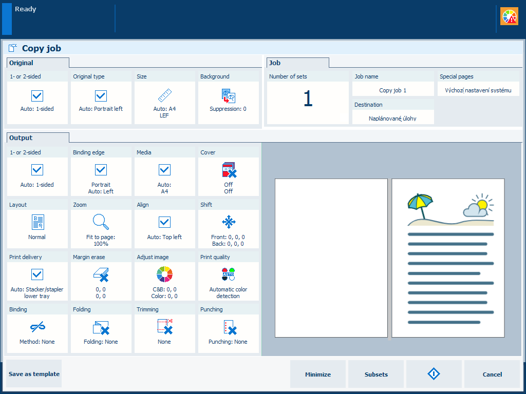 The following tables show the copy job properties you can change. Use the [Minimize] setting to minimize the copy job definition when you want to do other tasks on the control panel.