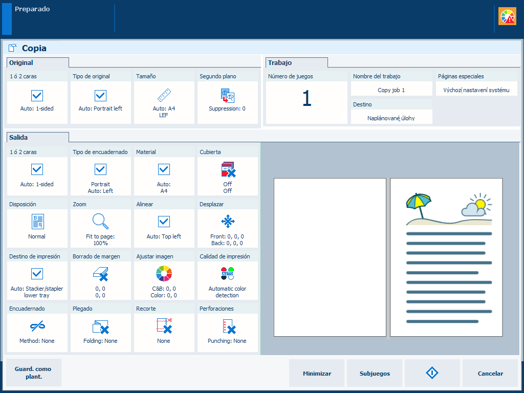 La sección [Salida] contiene los ajustes disponibles para definir el aspecto de la copia resultante. Todos los ajustes tienen una posición fija. Si un ajuste no es viable, la ubicación de ese ajuste estará vacía. Ejemplo: El ajuste [Recorte] solo está disponible si tiene una cizalla. De lo contrario, la ubicación del ajuste [Recorte] estará vacía. |