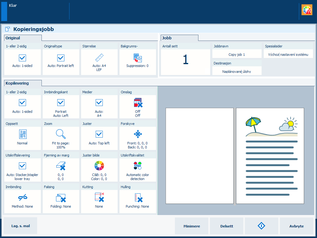 Med knappene i denne delen kan du velge en handling, for eksempel lagre innstillingene i en mal, avbryte jobben eller starte skanning. Med den valgfrie [Sideprogrammering] -funksjonen kan du sette inn og definere medier og etterbehandlingsinnstillinger for sideområdene i en jobb. |