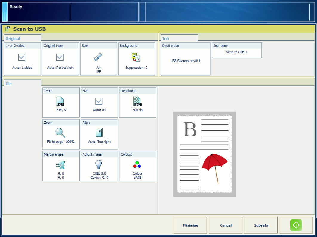 - Sur le panneau de commande, touchez [Travaux] -> [Copier/Numériser] -> [Numériser vers USB].