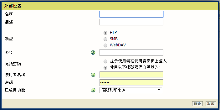[使用者名稱] 讓您能夠存取外部位置。 使用者必須至少具備外部位置的讀取和寫入權限。 SMB 目的地的格式如下: 本機使用者名稱: 「IP 位址\使用者名稱」或「主機名稱\使用者名稱」。 網域使用者名稱: 「網域\使用者名稱」。