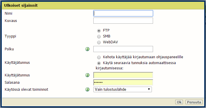 [Käyttäjätunnus] antaa ulkoisen sijainnin käyttöoikeuden. Käyttäjällä on oltava vähintään luku- ja kirjoitusoikeudet ulkoiseen sijaintiin. SMB-kohteissa muodon on oltava seuraavanlainen: Paikallinen käyttäjätunnus: 'IP-osoite\käyttäjätunnus' tai 'isäntänimi\käyttäjätunnus'. Toimialueen käyttäjätunnus: 'toimialue\käyttäjätunnus'.