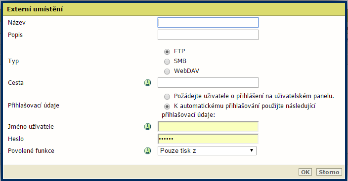 Volba [Jméno uživatele] umožňuje přístup k externímu umístění. Uživatel musí mít k příslušnému externímu umístění alespoň oprávnění ke čtení a zápisu. Pro umístění SMB musí být použit tento formát: Jméno místního uživatele: „adresa_IP\jméno_uživatele“ nebo „název_hostitele\jméno_uživatele“. Jméno uživatele domény: „doména\jméno_uživatele“.