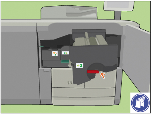 [Use handle 2 to open the flap and check for paper.] |