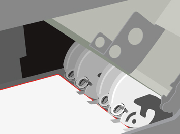 Ersetzen Sie die vier Wenderinge (in der nachfolgenden Abbildung durch (1) gekennzeichnet), wenn die Stapelqualität nicht ausreichend ist oder die Wenderinge abgenutzt sind. Die Wenderinge befinden sich hinter der vorderen Abdeckung.