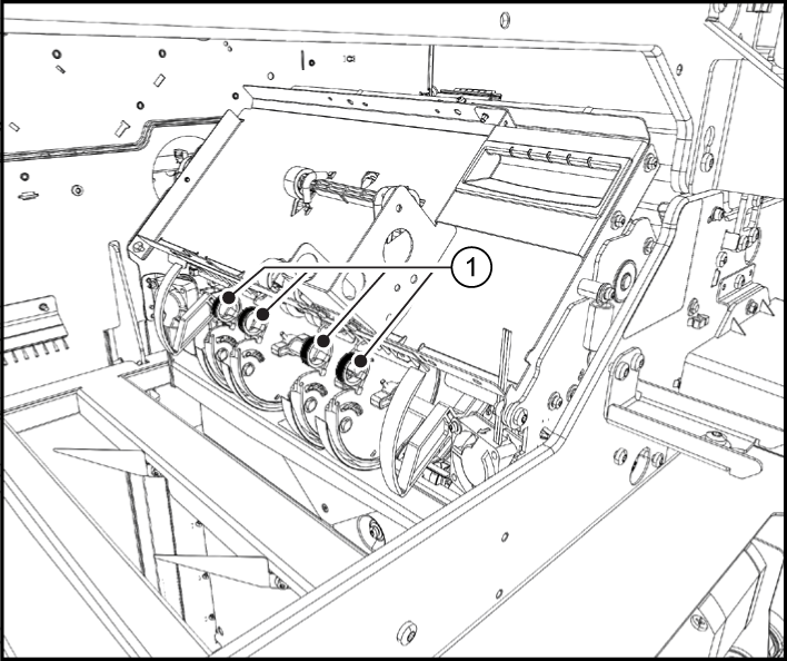 Replace the four flip rings (indicated by (1) in the illustration below) when the stacking quality is not OK or when the flip rings are worn significantly. The flip rings are located behind the front cover.