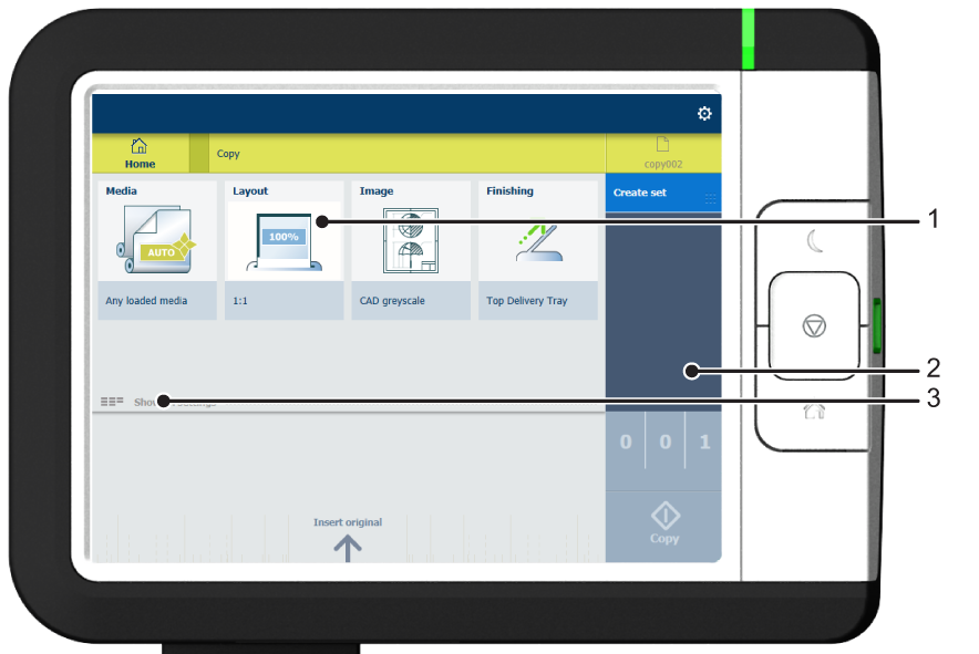 Amikor a másolás mozaikra koppint a kezdőképernyőn, megnyílik egy ablak a másolási előbeállításokkal, valamint a speciális beállításokkal. Amikor rákoppint a szkennelés mozaikra, a sablonok a Smart Access területen láthatók. Amikor ismét rákoppint a szkennelés mozaikra, megnyílik a speciális beállításokat tartalmazó ablak. Amikor a nyomtatás mozaikra koppint, és egy felsorolt munka beállításaira koppint, megnyílik egy ablak a nyomtatási előbeállításokkal és a speciális beállításokkal.