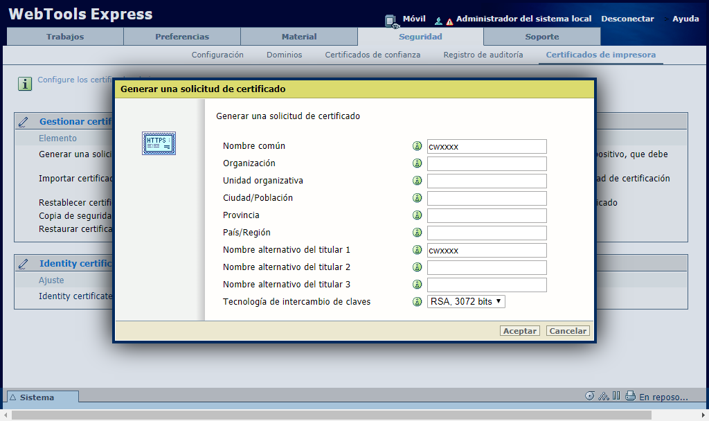 Para generar una solicitud de certificado, siga el procedimiento indicado a continuación.